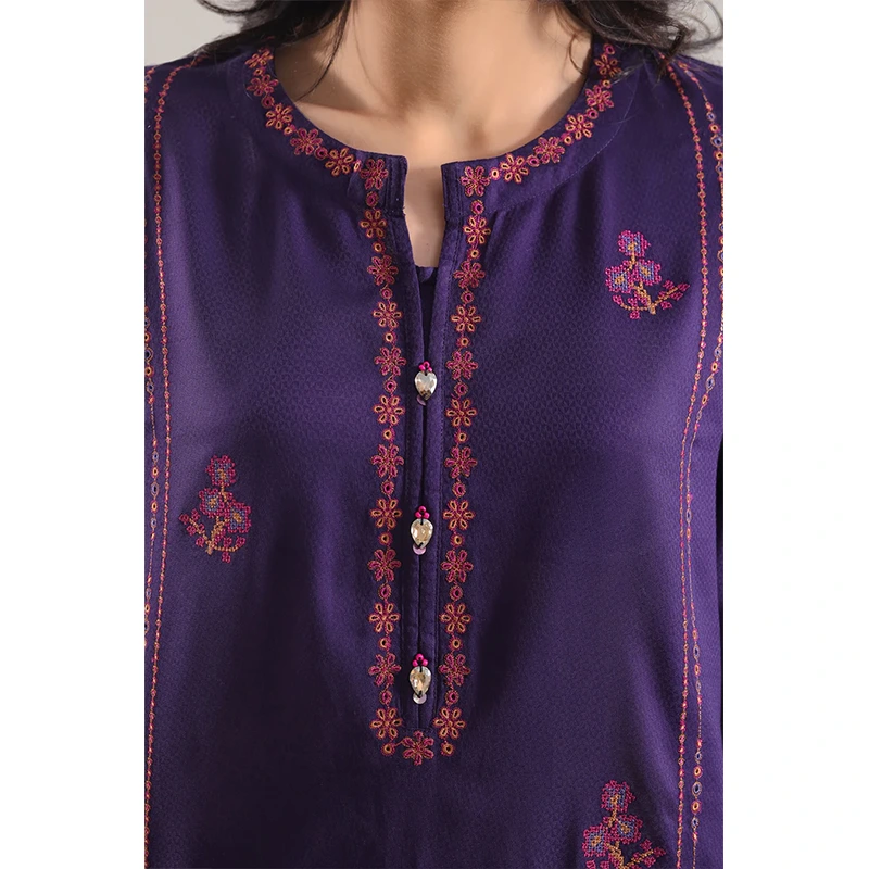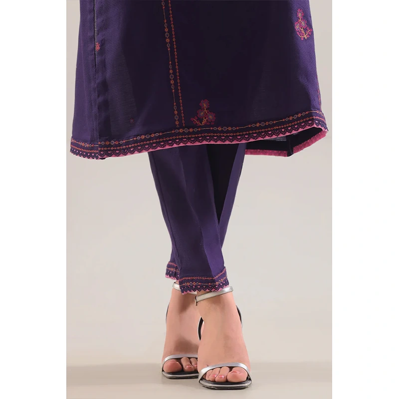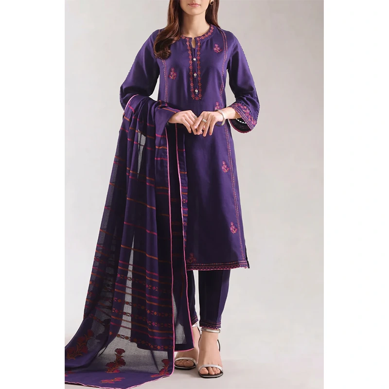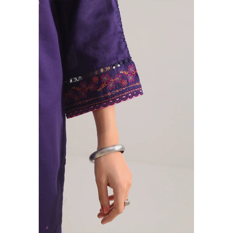 Classy And Radiant, This SAYA Luxury Pret Embroidered Cotton Jacquard Stitched 3-Piece In Purple Is A Statement Of Refined Festivity. The Premium Cotton Jacquard Fabric Offers A Rich Texture And Subtle Sheen, While The Detailed Embroidery Lifts The Purple Hues With Elegance. The Ready-To-Wear Shirt, Paired With A Coordinated Dupatta And Trouser, Delivers A Harmonized Silhouette That Speaks Festive Poise. Impeccable Stitching And Clean Lines Uphold Structure Without Sacrificing Comfort. An Ideal Choice For Weddings, Formal Gatherings, Or Celebratory Events, This Ensemble Balances Luxury, Wearability, And Artistic Appeal.