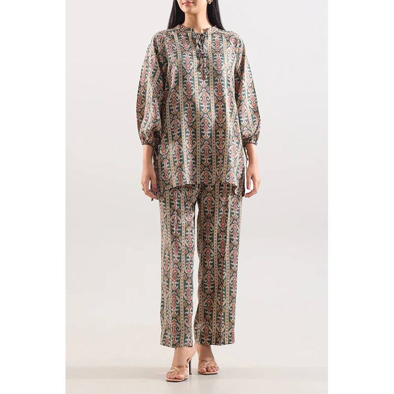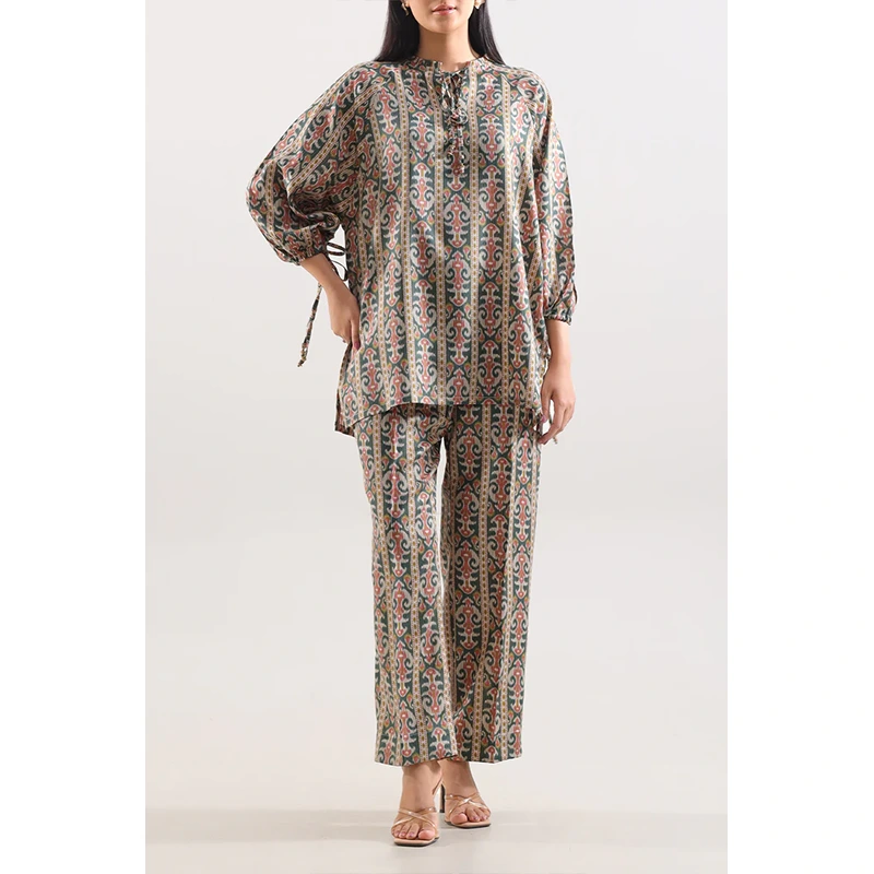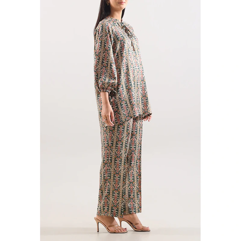 Elevate Your Summer Wardrobe With This Elegant Two-Piece From SAYA, Crafted In Lawn Fabric That Is Lightweight, Breathable, And Soft-To-The-Touch. The Shirt Features Delicate Arabic-Inspired Over A Subtle Print, Adding Cultural Sophistication With A Modern Twist. The Matching Trouser Complements With Tailored Stitching And A Smooth Silhouette. Ideal For Daytime Festivities, City Outings, Or Casual Gatherings, This Set Blends Quality Craftsmanship, Comfort, And Refined Fashion.