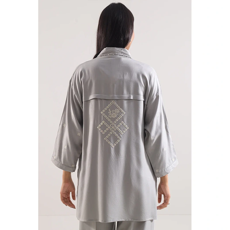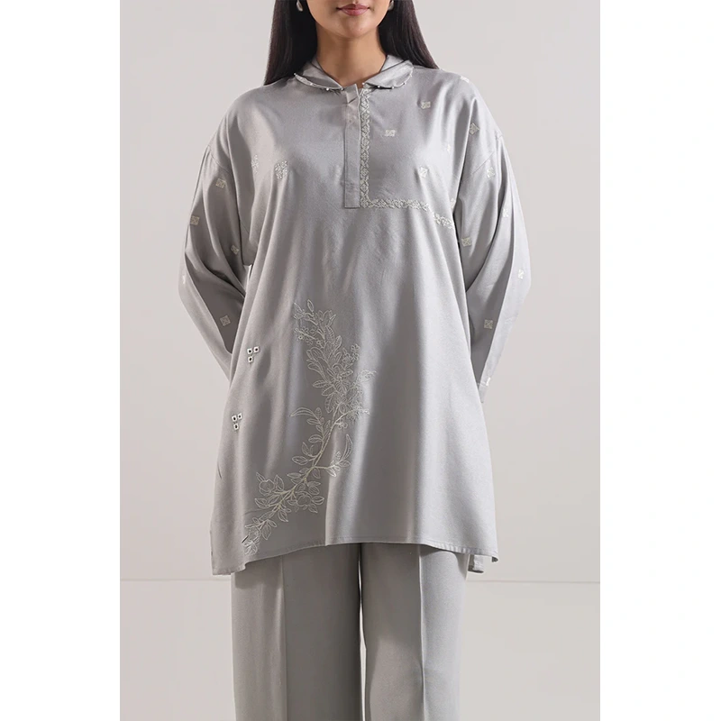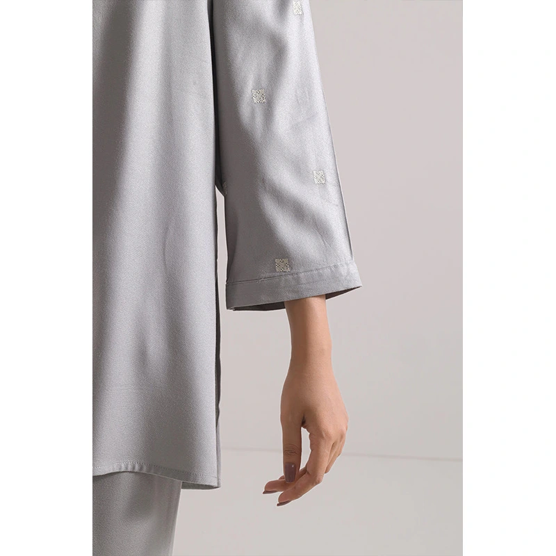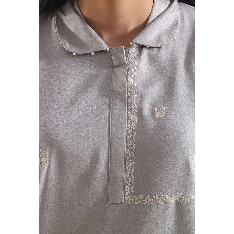 Premium Dobby Crepe Fabric That Delivers A Refined Texture And Soft Drape. The Sage Grey Hue Offers A Subtle, Sophisticated Appeal — Perfect For Daytime Gatherings, Office Wear Or Elegant Casual Looks. The Shirt Features Delicate Tone-On-Tone Embroidery That Adds Depth Without Overstatement, While The Trouser Complements With Clean Lines And Comfortable Fit. Impeccably Tailored With Neat Seams, Crisp Finish, And Durable Construction, This Ensemble Balances Utility And Poise With Ease.